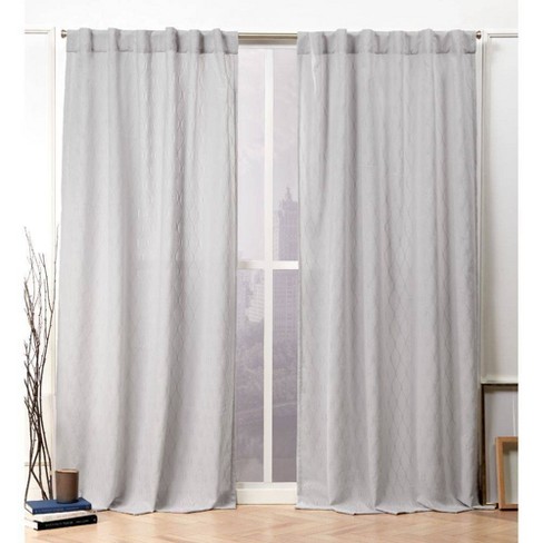 Drench your rooms in the exotic hues of our Bohemian, Moroccan, India inspired cotton sheer tab top & rod pocket curtain panels, and then simply stand back .Tab top curtains slide open and closed easily, drape nicely, and have a relaxed, casual feel. The tutorial includes a video, written directions, and photos..Buy the Belgian sheer hidden tab top curtain panel pair, snowflake, 50x108 online from Houzz today, or shop for other Curtains for sale. Get user reviews on all .Save on tab top curtains of all kinds at ChristmasTreeShops.com. Get tab top curtain panels, tab top sheer curtains, tab top blackout curtains and more. Buy now..The sheer design provides privacy while still letting in light. Peri Home Suri Tab Top Curtain Panel, 50" x 95". Gray Metallic .Lauren Semi Sheer Back Tab Rod Pocket Panels Set of 2 White. Back Tab Rod Pocket semi sheer curtains give a light, romantic and airy look to a room by .MATILDA Sheer curtains, 1 pair, white. A perfect solution when you want privacy or want to block annoying glares on TV and computer screens. The outside light .Deconovo offers sheer curtains in an assortment of materials, sizes and styles, including rod pocket, grommettop, cafes and tabtop. Browse our website to find .Shop with The Curtain Shop for the best selection of tab top curtain panels on the net. Palm Beach Semi Sheer Back Tab Panel Pair with Pinch Pleated Front..Elbert Vine Floral Pattern Embroidered Tab Top White Sheer Curtain Panels Online. These white sheer curtains can be used for living room windows, bay